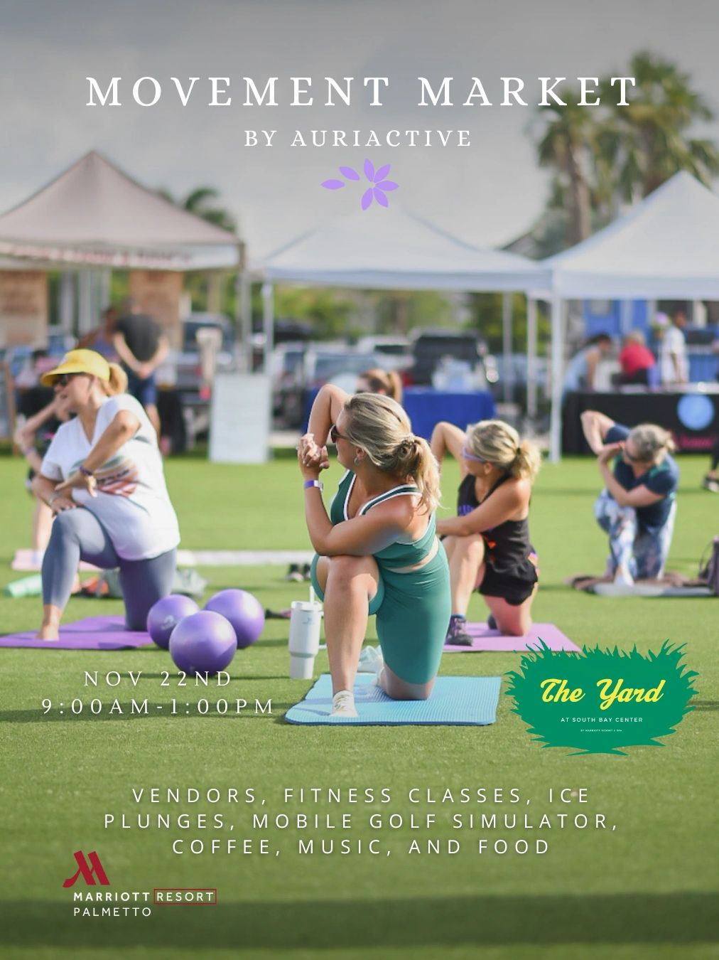 Join us in the Yard at the Palmetto Marriott for a morning of health and wellness vendors, fitness classes, ice plunges, mobile golf simulator, coffee, facials, music, food, and more!
